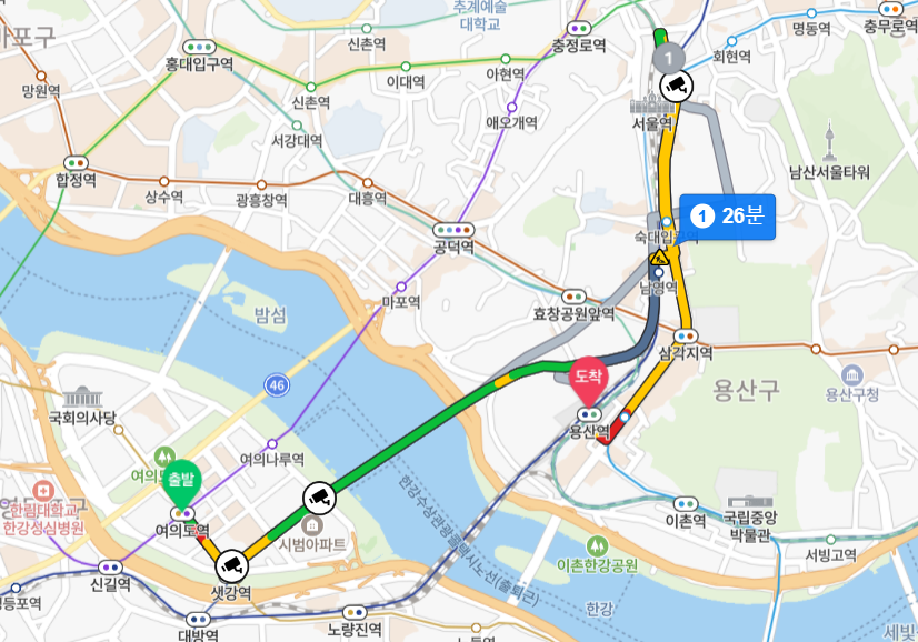 TMS 에서는 최적의 배차 계획을 시뮬레이션 할 수 있습니다. 반면에 TMS 가 없는 경우에는 아래와 같은 경로의 운송 일정으로 배송을 진행하기도 합니다. 여의도 출발하여 서울역 경유하고 최종으로는 용산역에 도착하는 운송 경로입니다. 당연히 시간도 많이 소요되고, 비용도 증가하는 잘못된 운송계획입니다. TMS 는 이러한 운송 경로도 모니터링하고 최적의 경로로 변경할 수 있는 시뮬레이션도 지원합니다.