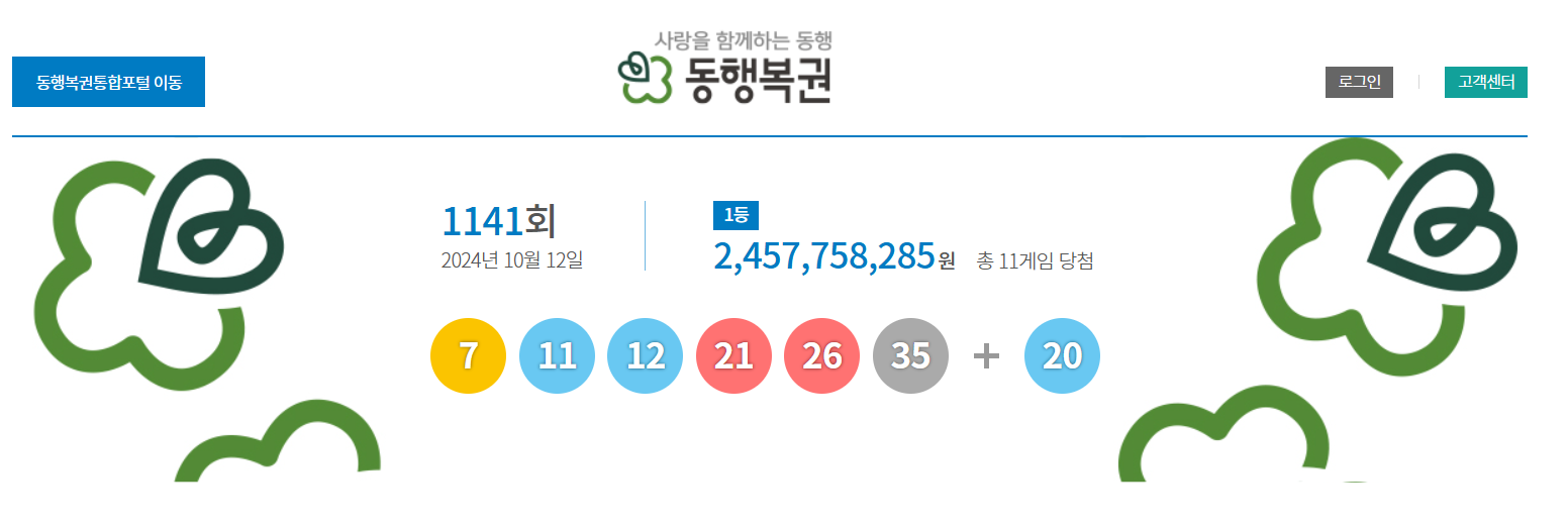 2024년 10월 12일 추첨한 1141회 당첨결과는 7, 11, 12, 21, 26, 35 과 보너스 번호 20 입니다.